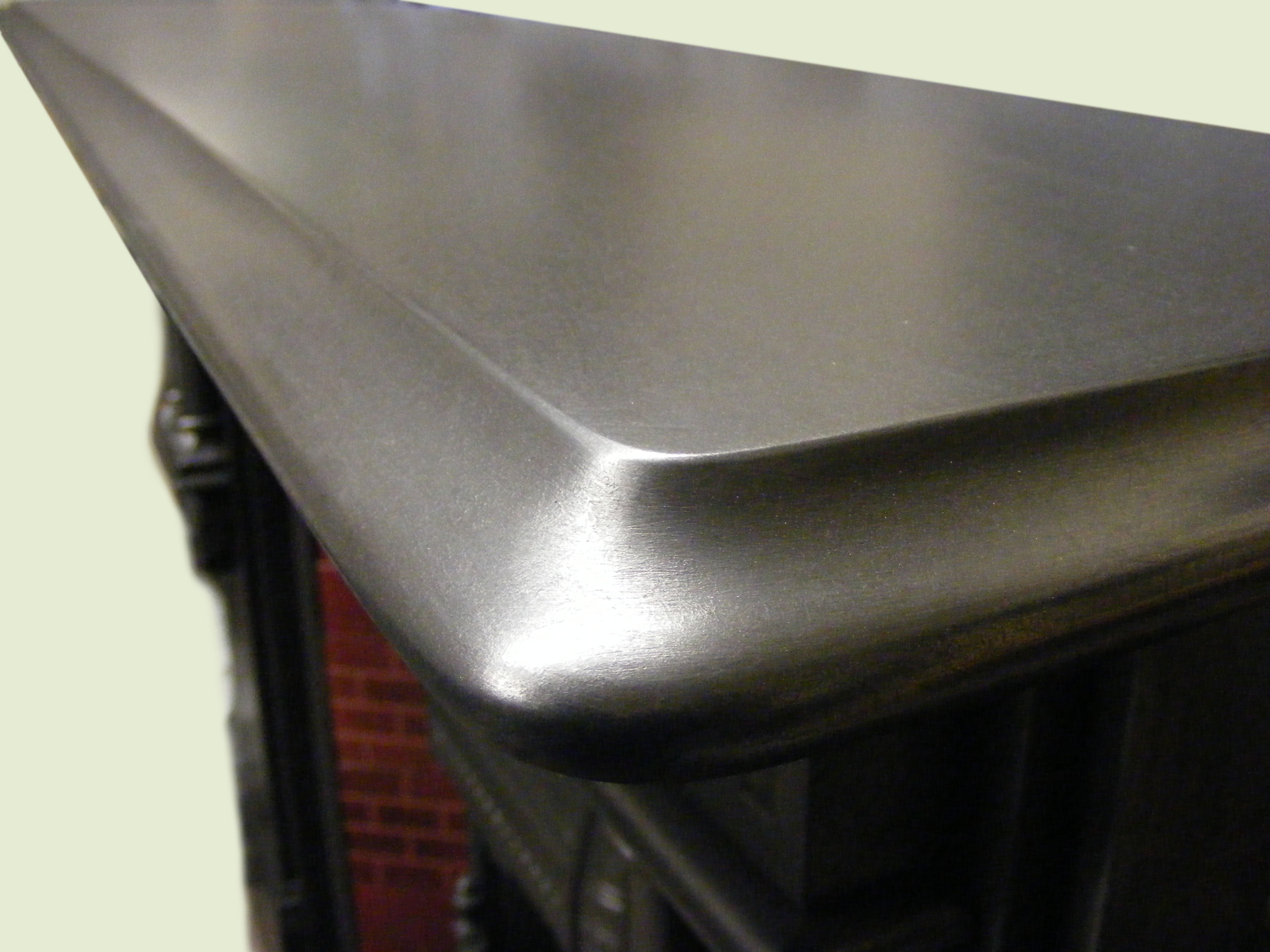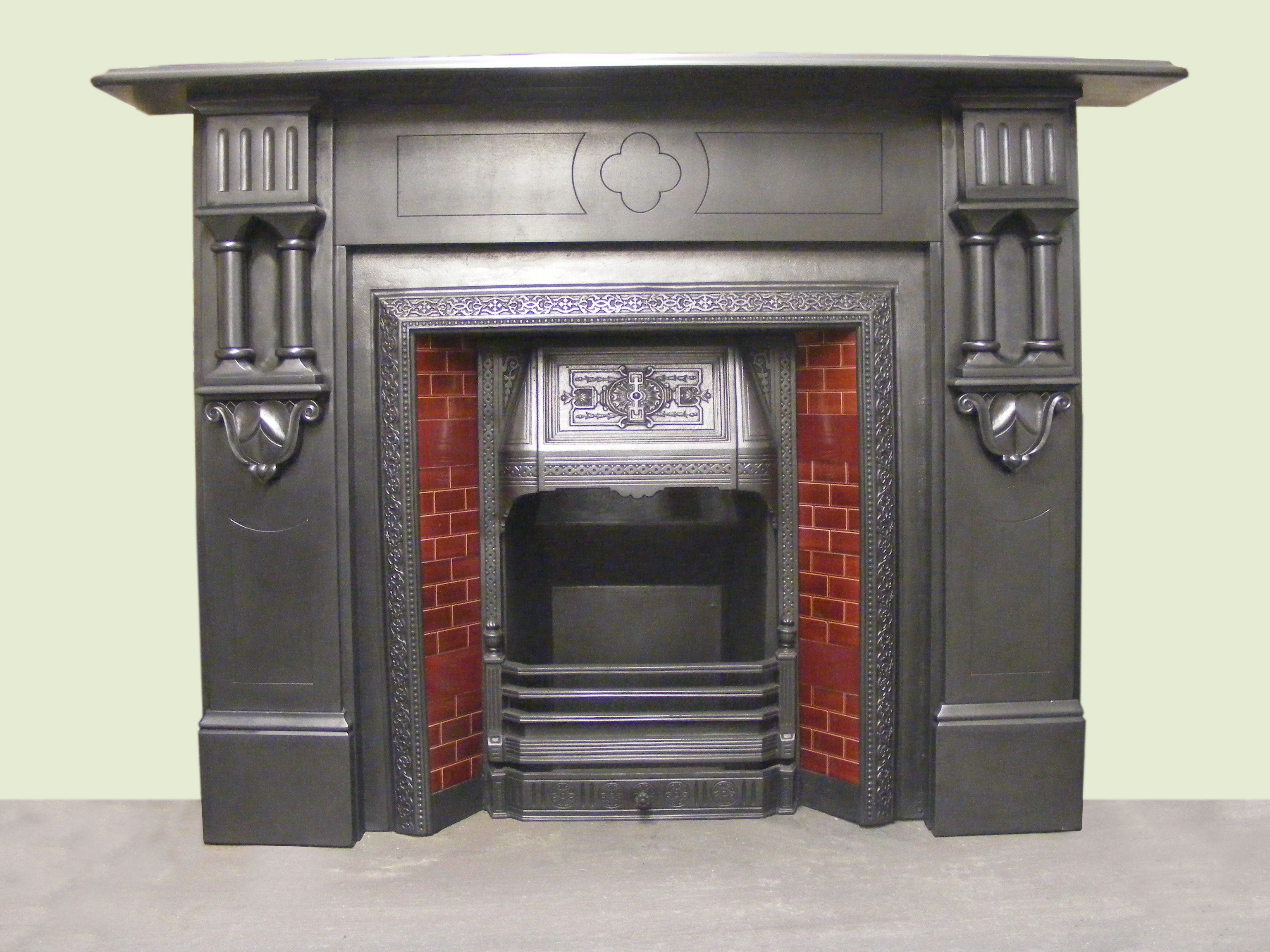 Victorian Gothic slate fire surround (ASS-1631) A Victorian Gothic Slate fire surround of great proportions with fine stencilling to the legs and featuring a bold stencilled quatrefoil to the frieze flanked by a beautifully made pair of demy-pillar capitals on intricately sculpted ovoid bases, rising to fluted top mounts. An outstanding fire surround with fabulous gothic detailing. Measures 64’’wide x 47’’ high with an opening of 38’’ high x 38’’ wide. Its priced at £2000.00.