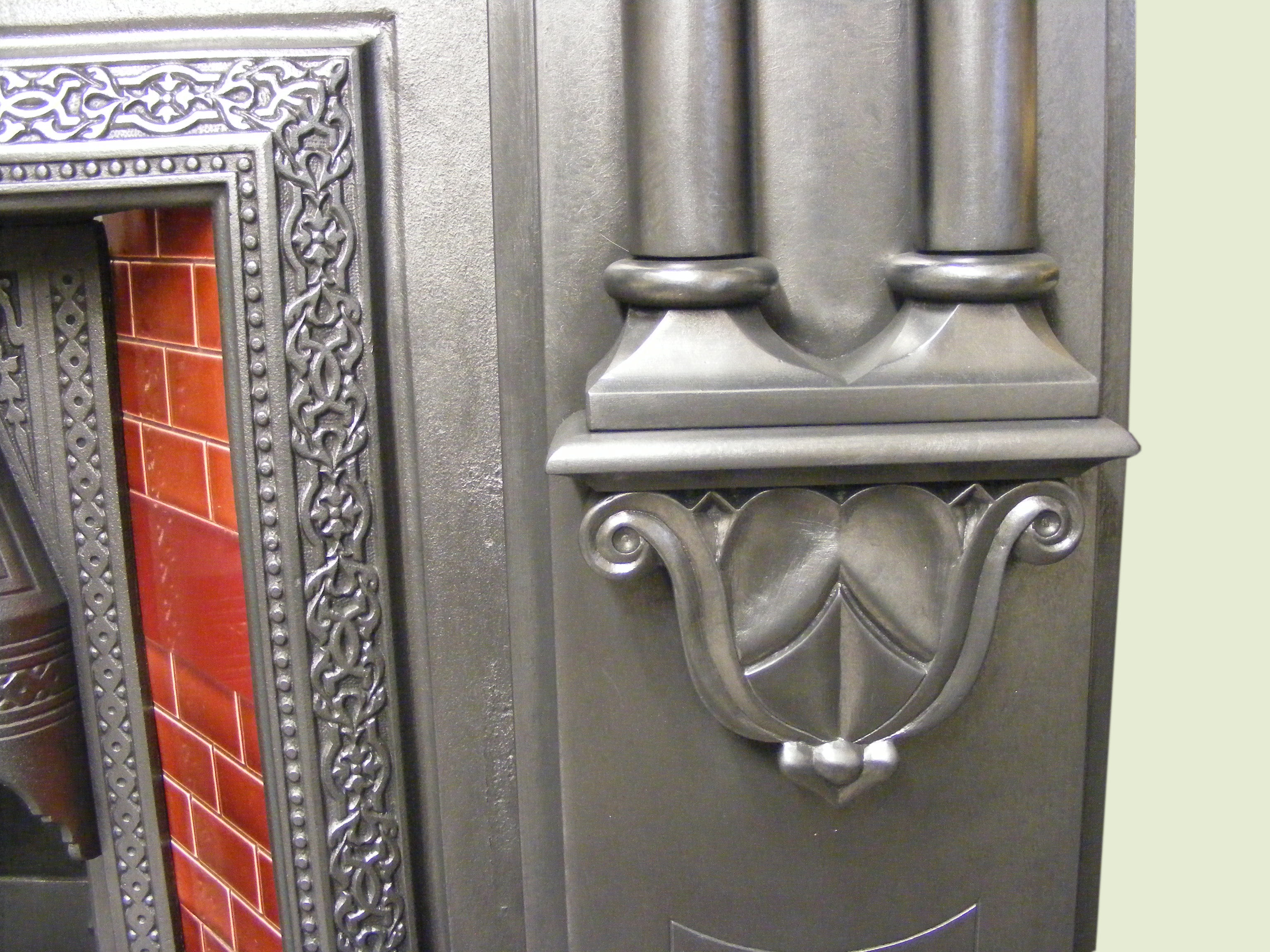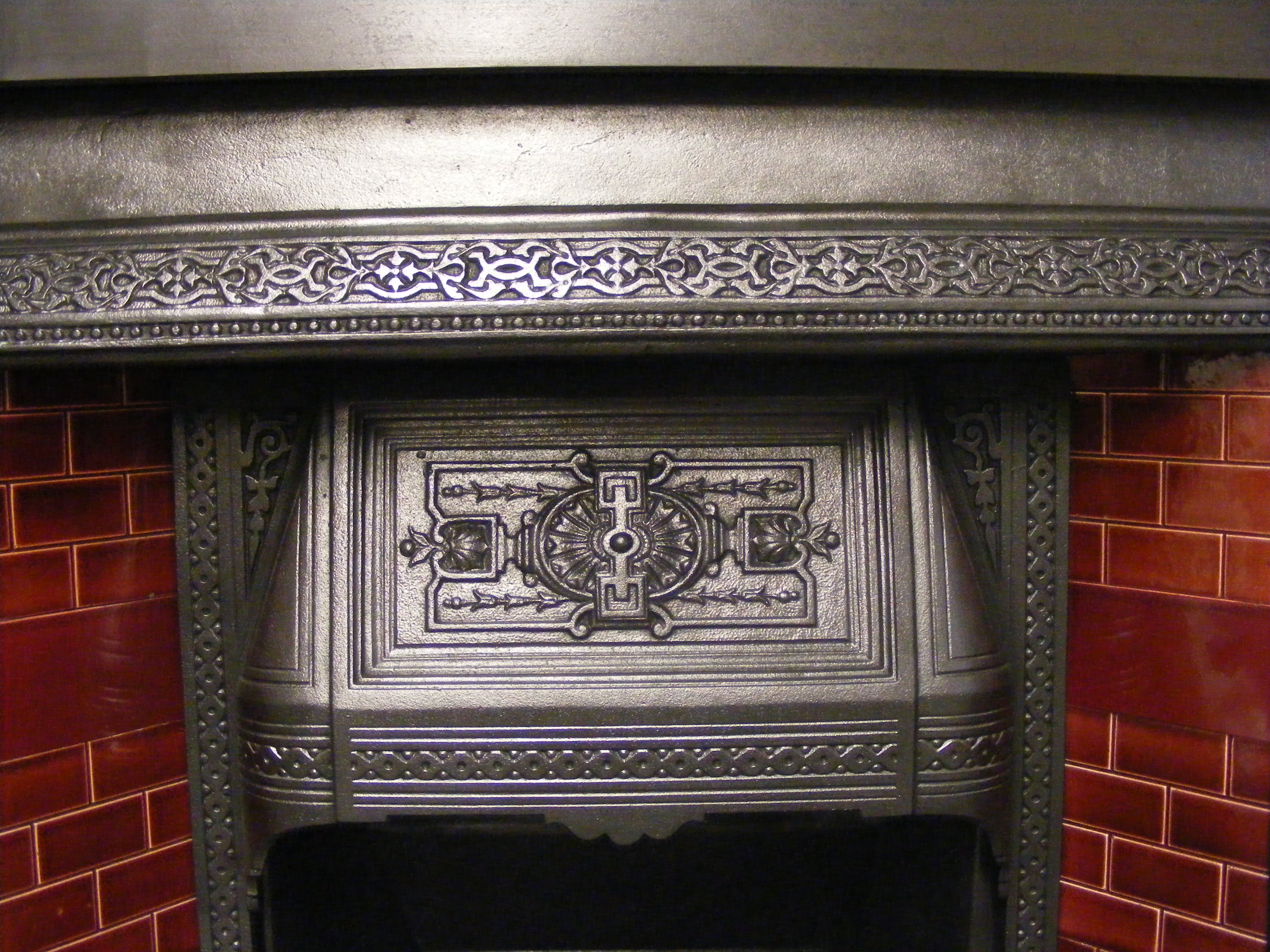 Victorian tiled insert (ATI-1632) a substantial Victorian tiled insert made in the 1890s at the Biclam iron foundry in Ardwick Manchester by the Bennets iron company ltd, a nicely detailed example including its original red brick style tiles. It measures 38’’wide x 38’’high with an 18’’fire opening, making it an ideal log burner. Supplied with a new clay fire back. Priced at £800.00.