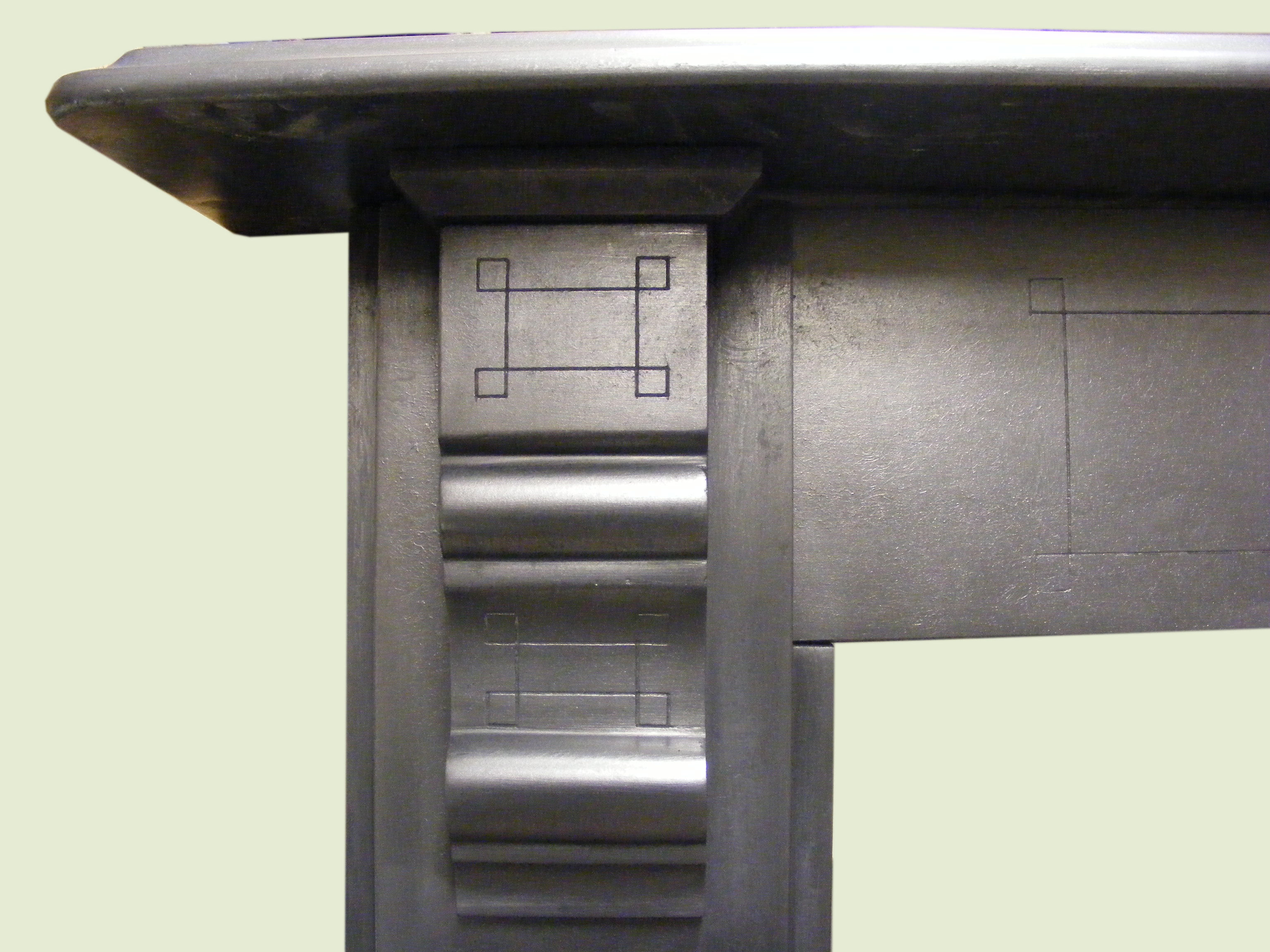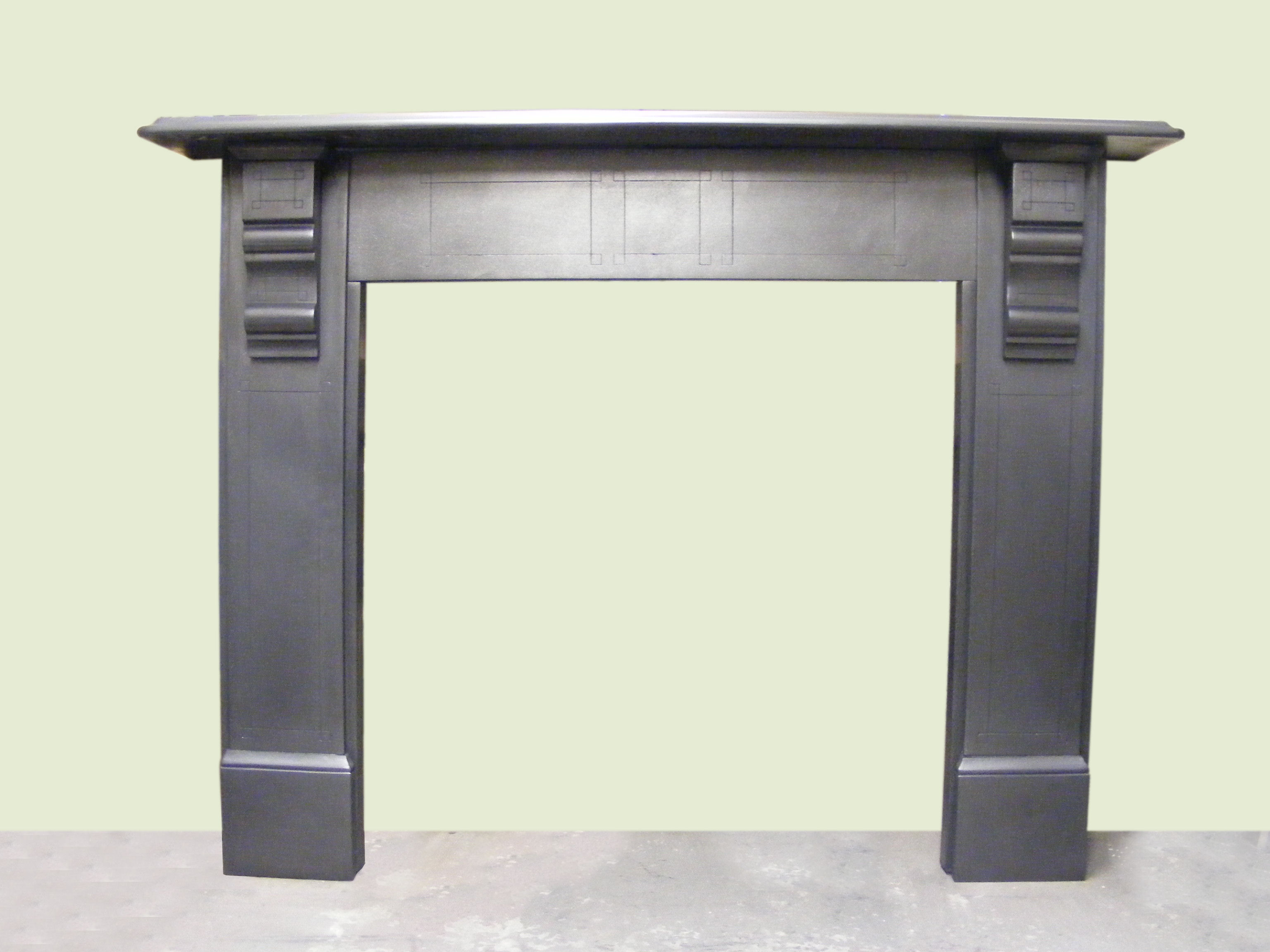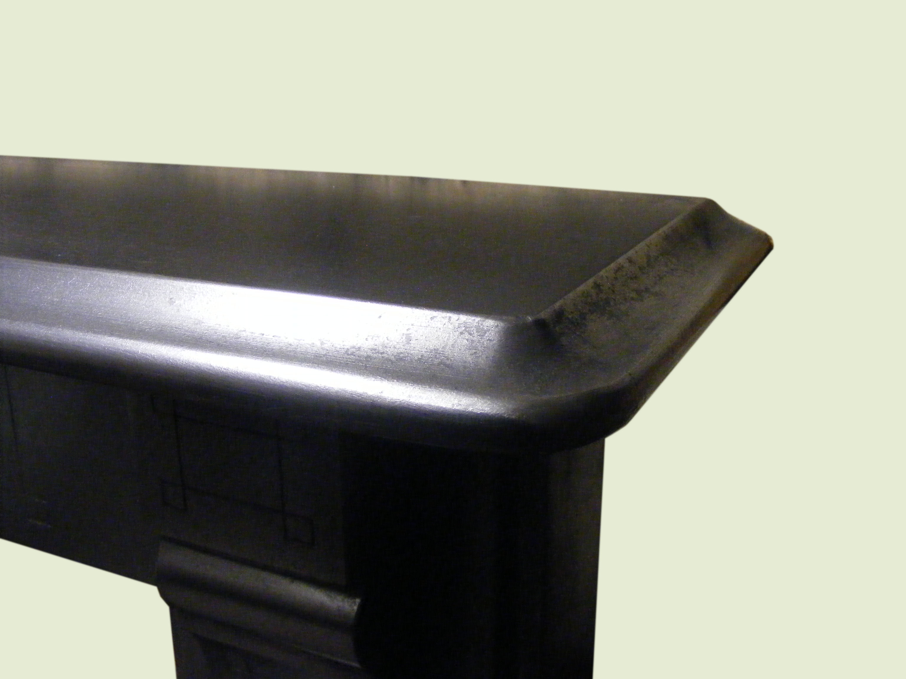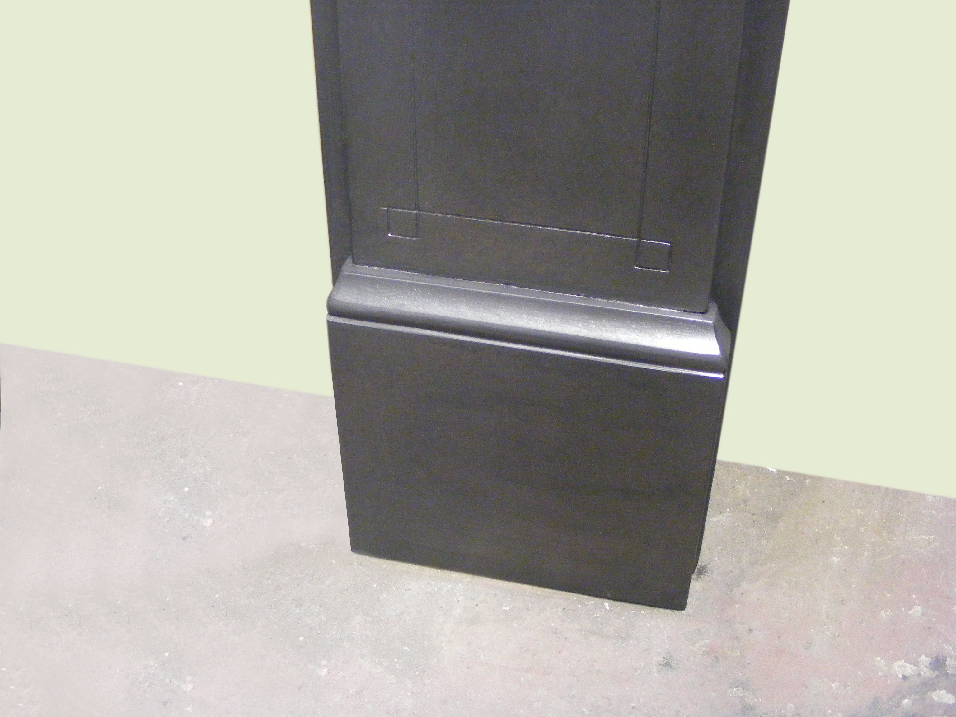 Victorian slate fire surround (ASS-1637) An appealing Victorian slate fire surround with corbelled capitals and extensive stencilling to its legs and Frieze, a substantial Victorian slate fire surround which has been hand stripped and polished to a lustrous black finish. Measures 62”wide x 47”high with an opening 38”wide x 38”high. Priced at £1200